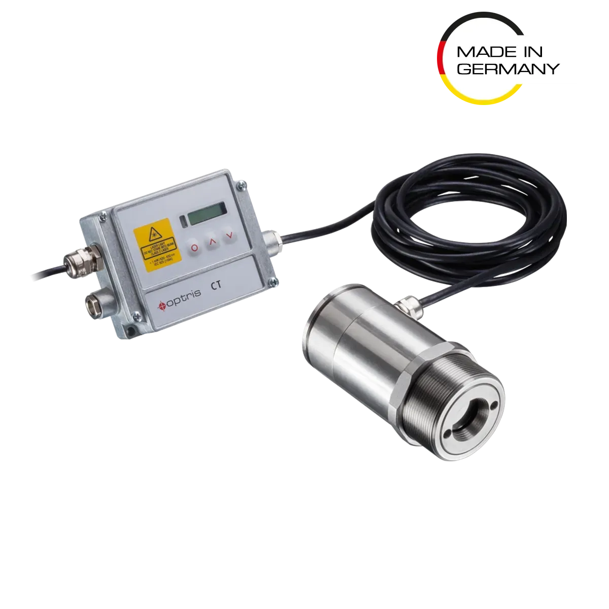 IR thermometers of CTlaser Series are perfect for demanding industrial settings. Equipped with robust cooling or air purging accessories, they provide essential protection for the sensor. The CTlaser separates the sensor head from a remotely positioned electronics box, which includes an LED display and user controls. Diverging lasers are also included, making it easy to pinpoint the exact size and location of the measurement spot.