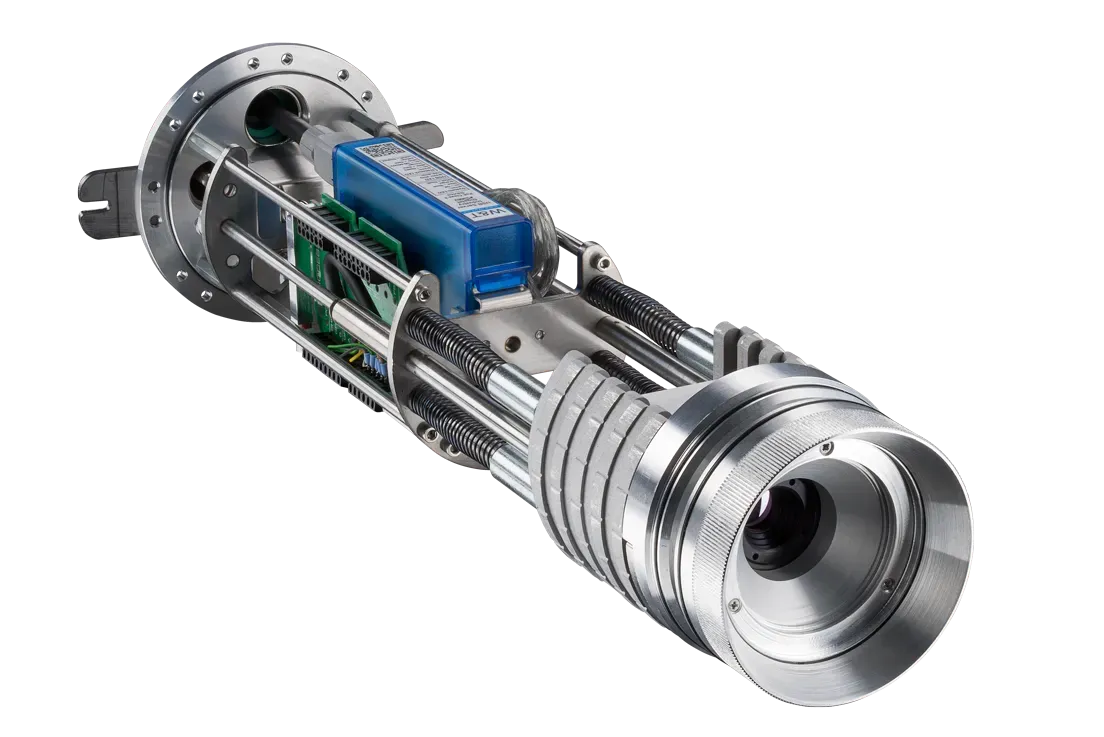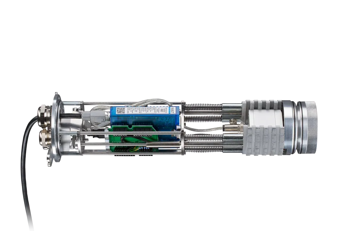 The Optris CoolingJacket Advanced is a versatile protective housing designed for optris infrared thermometers and cameras, enabling operation in high-temperature industrial environments. While infrared cameras will operate up to 315 °C, pyrometers can withstand 250 °C ambient temperature. It features water cooling with optional protective windows, ensuring optimal performance and longevity of the sensors. The modular design allows for the easy integration of various devices and optics, while the quick-release chassis facilitates straightforward sensor maintenance. The extended version can incorporate additional components such as the PI NetBox, USB Server Gigabit, and Industrial Process Interface. The CoolingJacket Advanced is constructed from durable V2A material, offers an IP65 environmental rating, and includes an air purge to keep the infrared sensor’s optics clean.