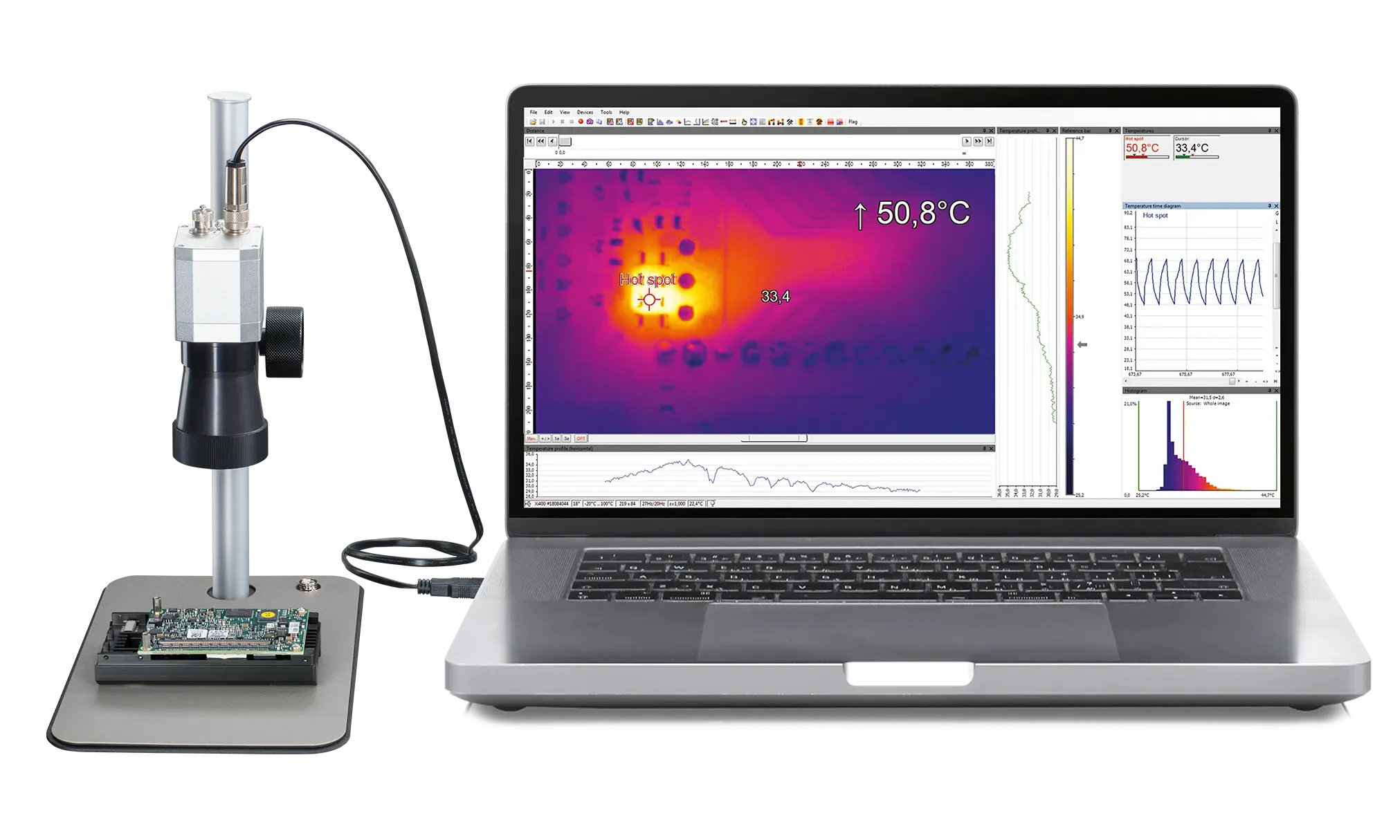 The Optris Microscope optics is an accessory for customers with the PI 640i infrared camera and another interchangeable optic. This microscope optic enhances the PI 640i’s capability to thermally analyze entire circuit boards and detailed macro shots of individual components. Its high-quality thermal and geometric resolution ensures effective and precise functional testing of electronic products.